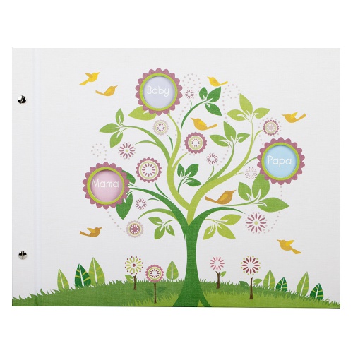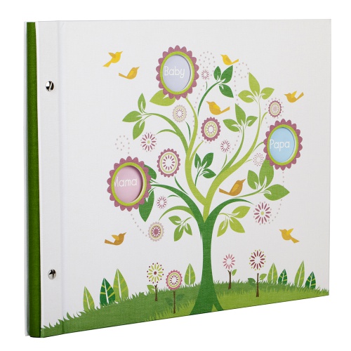 Ein Babyschraubalbum im Stammbaumstil. Auf dem Cover rangt ein liebevoll gezeichneter Stammbaum in dem drei Ausstanzungen für ein eigenes Bild vorhanden sind. Der Einband dieses wunderbaren Kinderalbums ist aus feinstem Leinen und ist sehr hochwertig gefertigt. Das Babyalbum bietet Platz für bis zu 200 Fotos verteilt auf 40 Seiten. Die Schraubbindung ermöglicht Ihnen das einfache Austauschen oder Erweitern (max 30 Seiten - 15 Blätter) der Albumseiten. Dadurch erreichen sie ein hohes Maß an Flexibilität. Dieses Album wird Ihnen viel Freude bereiten.